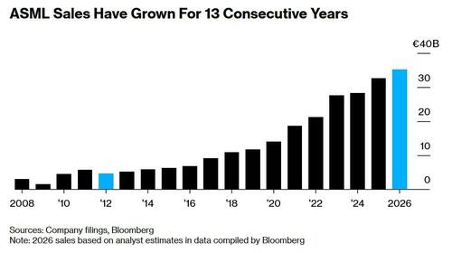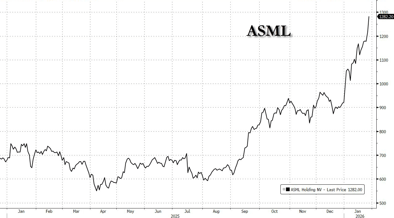 Shares in ASML, Europe's most valuable company which builds the 'printing presses' for modern microchips, exploded higher in Wednesday trade after Q4 orders blew past analyst estimates. The Dutch semiconductor company also announced job cuts to boost efficiency, and a share buyback of up to €12B by the end of 2028.