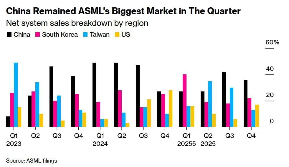 China was ASML's largest market in the fourth quarter - accounting for 36% of net system sales. That said, the Chinese market is expected to drop to around 20% of revs going forward, CFO Roger Dassen said in a call with reporters.