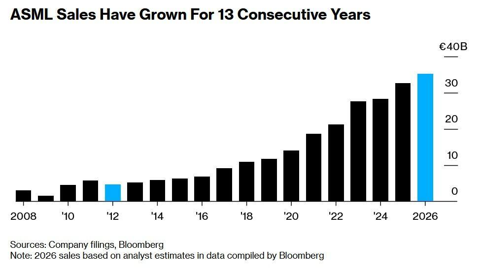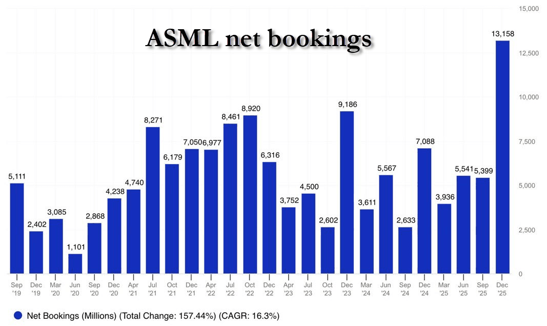 Fueled by demand for AI chips, bookings in the fourth quarter hit a record €13.2 billion ($15.8 billion), the Veldhoven, Netherlands-based company said in a Wednesday announcement reported by Bloomberg. Analysts estimated an average of €6.85 billion, according to the report. Sales were €9.72bln (exp. €6.95bln).