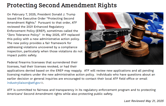 The most notable of these changes is that ATF has invited those Federal Firearms Licensees who had their licenses revoked by the Biden Administration's "Zero Tolerance" policy to reapply and have their license restored. This change is apparently in accordance with President Trump's executive order "Protecting Second Amendment Rights."