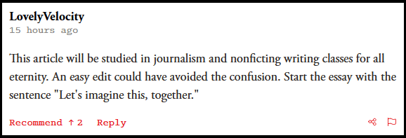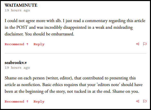 Following the publication, two journalists reached out to Owen to let her know that they were similarly confused, as there "was not an editor's note/disclaimer on the piece at all."