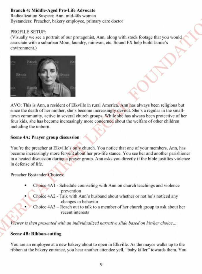 Ann is seen as a threat because she became “increasingly devout” and “increasingly more fervent about her pro-life stance” after the death of her mother. After she is overheard asking a question about the bible’s stance on “violence in defense of life,” an intervention is recommended. The memo encourages her “preacher” to schedule counseling for Ann, talk to her husband and query other members of her “church group” about her behavior.