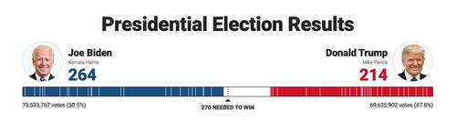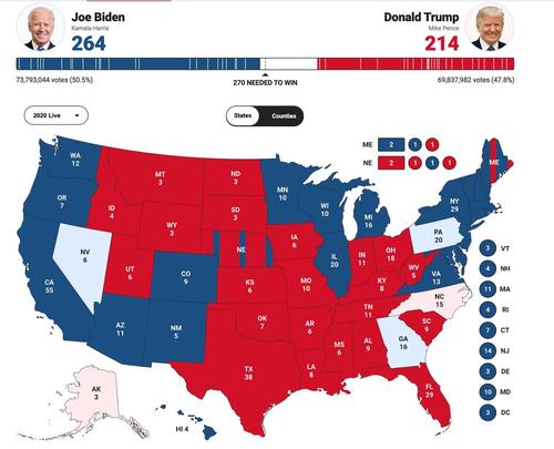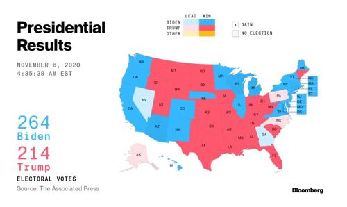 Biden has 264 electoral votes; Trump has 214, according to the AP and Bloomberg.