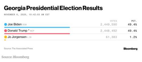 - GEORGIA: Biden leads Trump by 1,587 votes, 49.4% to 49.37% with 99% of votes in