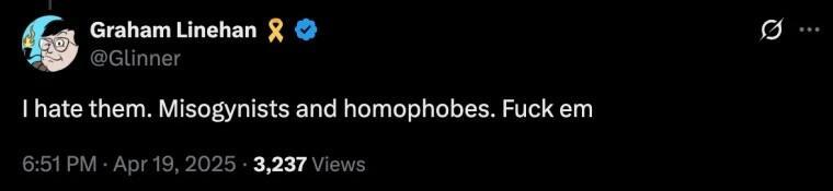 Linehan has been targeted for cancellation and much worse for years now, since making his views on the gender issue clear:
