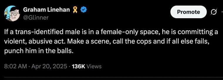 Linehan defended his posts, explaining that the ‘punch’ tweet was “a serious point made with a joke,” explaining that “Men who enter women’s spaces ARE abusers and they need to be challenged every time.”