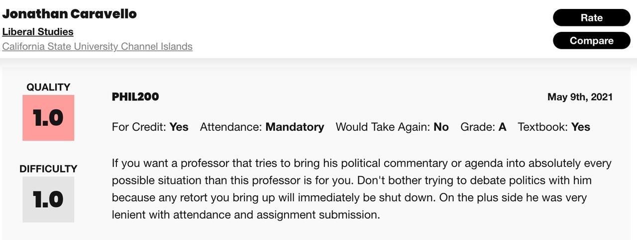 Campus Reform reviewed Caravello’s student evaluations on the website RateMyProfessors.com.
