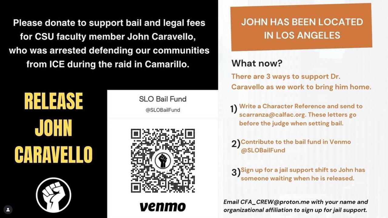 Meanwhile, the California Faculty Association is urging supporters to contribute monetary donations for bail and legal fees for Caravello.