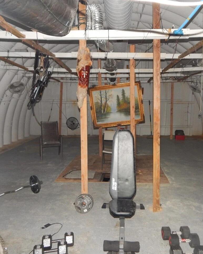 The bunker, equipped with power, ventilation, a concrete floor with built-in drainage, and the necessary supplies to grow weed, also contains a home gym, armchair, television, and workbench with a Bennington flag.