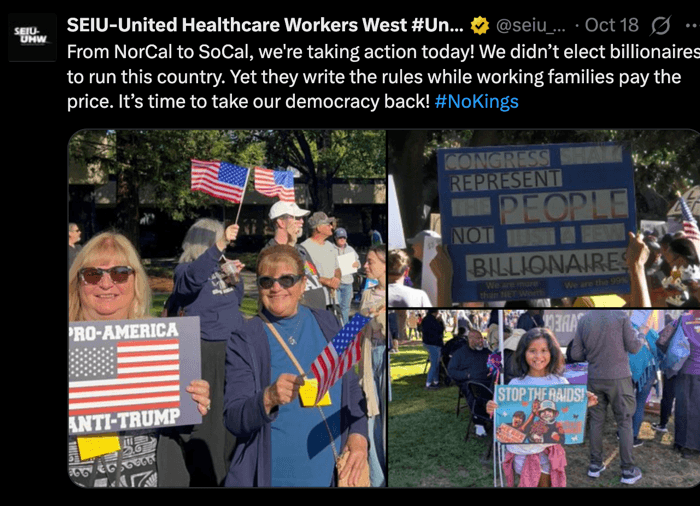 S.E.I.U.-U.H.W. joined a "No Kings" rally against Trump earlier this year. What the union does not want you to know is that the rally was funded by dark-money NGOs tied to leftist billionaires. It was merely a propaganda scam from the start. In reality, the union functions as little more than a megaphone for the Democratic Party’s unhinged left-wing billionaire class that openly hates America and capitalism.