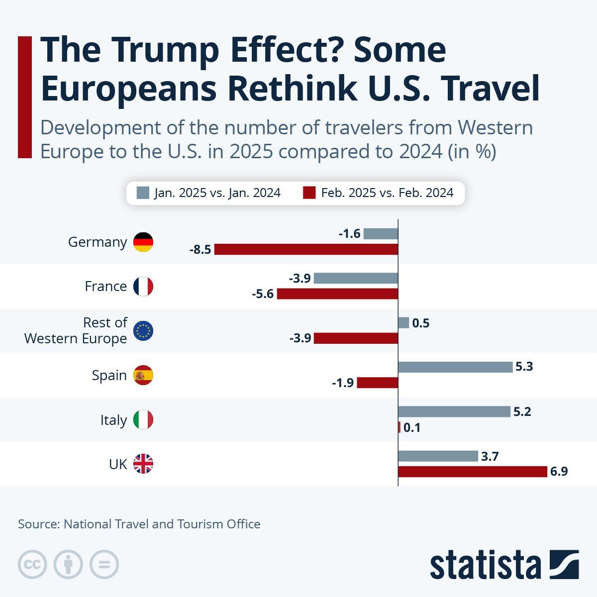 Some Europeans are among those rethinking their trips to the United States in protest against Trump. According to National Travel and Tourism Office data, there was an 8.5 percent decrease in the number of German travelers arriving to the U.S. between February 2025 and February 2024, a 5.6 percent decline in French travelers and a 3.9 percent decline among other countries in Western Europe. The United Kingdom and Italy show a different trend, however, with a 6.9 percent and 0.1 percent increase, respectively, between February 2024 and 2025.