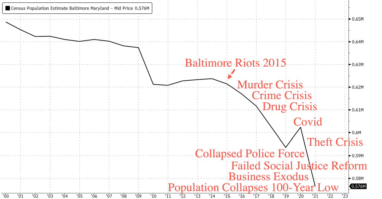 The most damning chart Democrats don't want folks to see is the latest exodus from Baltimore City, starting around 2015, mainly driven by failed progressives that unleashed a manufactured crime tsunami of their own doing, making any gang scene from HBO's The Wire look like child's play.