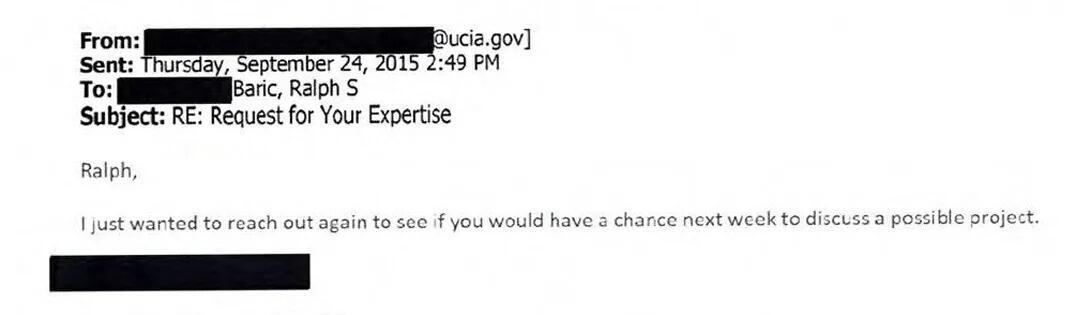 The email exchange with the subject line “Request for Your Expertise” shows an unnamed government official with a CIA-affiliated email address pitching a “possible project” to Baric relating to “[c]oronavirus evolution and possible natural human adaptation.”
