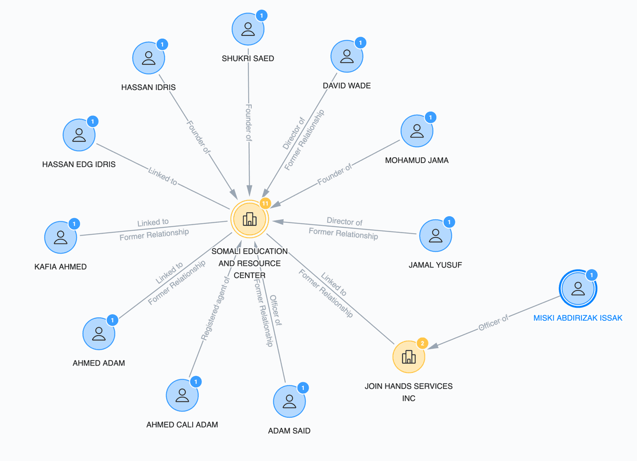 Using publicly available data, we're able to produce a network map of the Somali Education & Resource Center entity: