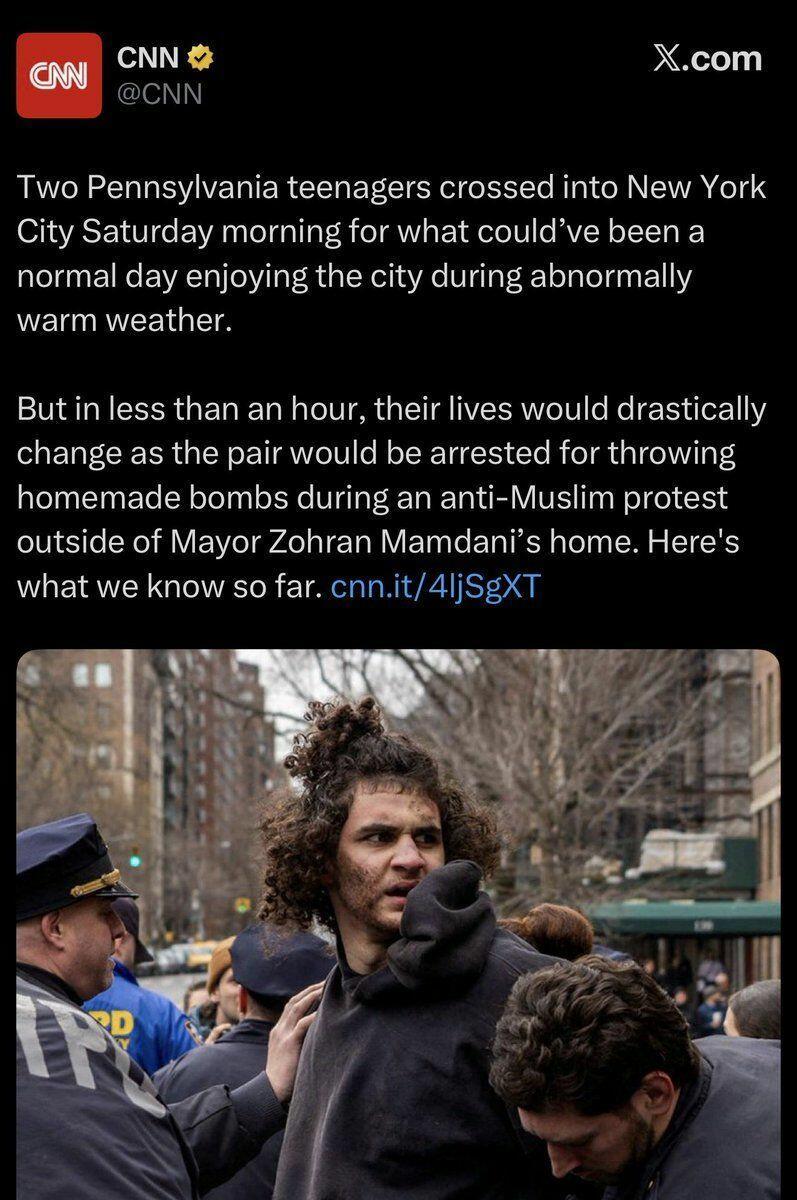 In a now-deleted tweet, CNN wrote "Two Pennsylvania teenagers crossed into New York City Saturday morning for what could've been a normal day enjoying the city during abnormally warm weather. But in less than an hour, their lives would drastically change as the pair would be arrested for throwing homemade bombs during an anti-Muslim protest outside of Mayor Zohran Mamdani's home."