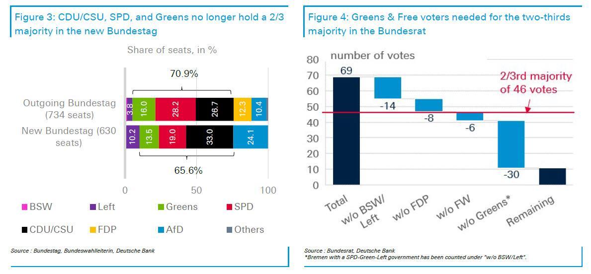 BSW motion on election result before the constitutional court. On Tuesday, the far-left BSW filed a motion for preliminary injunction before the constitutional court in order to postpone the announcement of the official federal election result on Friday. The BSW narrowly missed entering the Bundestag with 4.972% of the votes according to provisional results. Legal experts see rather low chances of this motion for a recount being successful. If the BSW were successful and entered the Bundestag after a recount, the CDU/CSU and SPD would no longer achieve a majority in the new Bundestag.