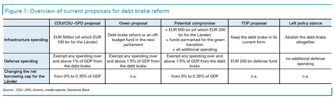 - On defence, the CDU/CSU-SPD could accommodate the ask of the Greens and agree to exempt defense spending above 1.5% of GDP from the debt brake.
