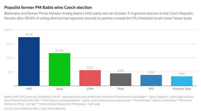 Billionaire Andrej Babis's ANO party won the Czech Republic's general parliamentary election on Saturday, and is set to return as prime minister to the central European country, raising the prospect of yet another splinter government within the EU bloc that would boost Europe's populist, anti-immigration camp and reduce support for Ukraine. It was also another booming stamp of disapproval for the EU's policies.