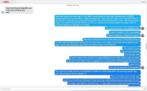 In one text exchange between Joe and Hunter, Joe wrote "Good morning my beautiful son. I miss you and love you. Dad." To which a petulant Hunter raged at his father for "having made clear to the world that the only reason for not [running for president is your] family problems im glad to be the f***ing bullseye you painted on my back."
