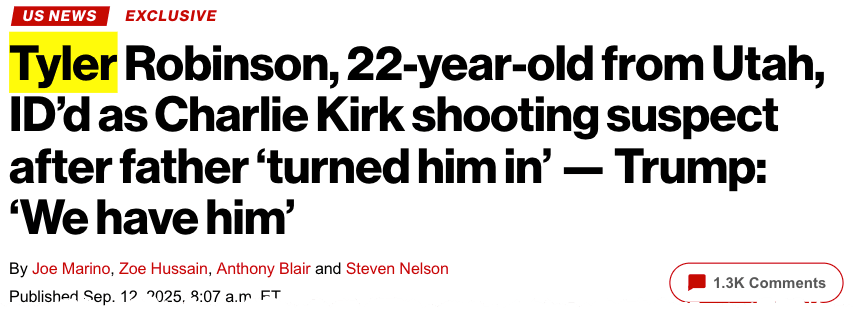 AP News and the New York Post both report that the suspect in the Charlie Kirk assassination is 22-year-old Tyler Robinson of Utah. Robinson's father apparently turned him in to the authorities - that is the official narrative so far.