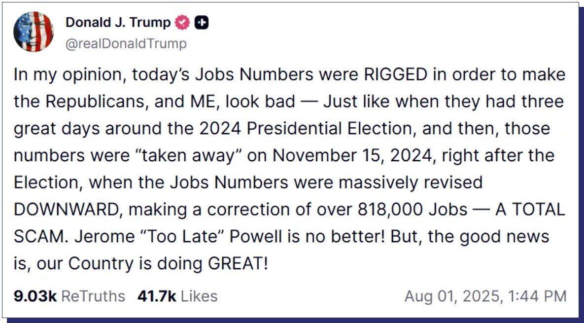 I could be wrong. Maybe Trump is right. Maybe the former head of the BLS deliberately released negative revisions to conceal the real job numbers, which would have to be truly fantastic. Otherwise, why try to hide them?
