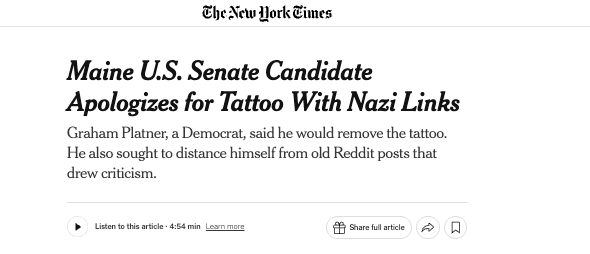 Back to SRA, The Maine Wire's Steve Robinson reports, "Graham Platner, the ex-Marine running against Gov. Janet Mills (D) for the Democratic U.S. Senate nomination, instructed members of the Socialist Rifle Association on paramilitary tactics."