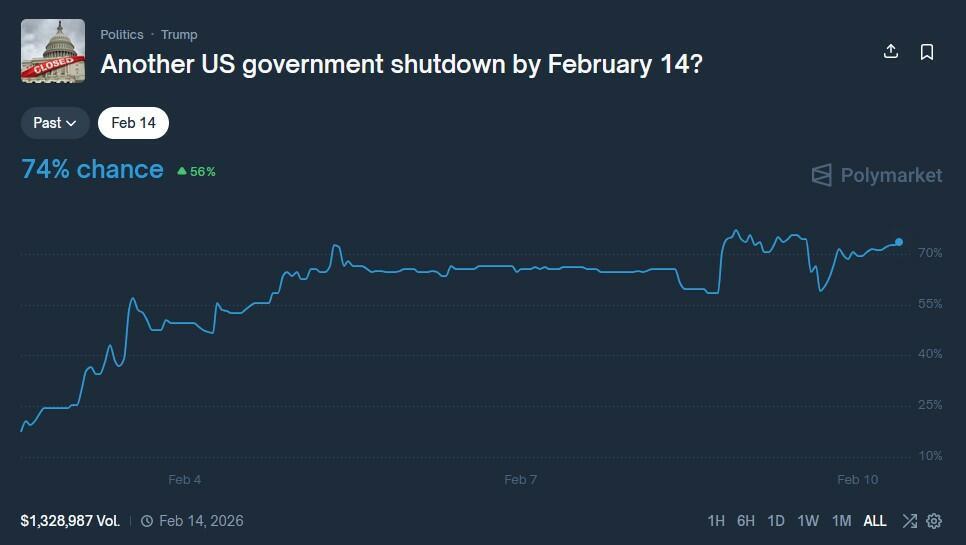 According to Polymarket, there's currently a 74% chance of a shutdown by Saturday.