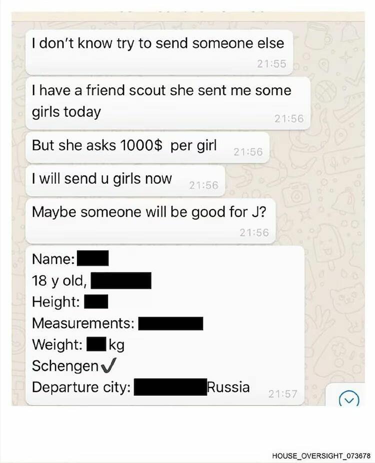 "I will send u girls now," the message says. "Maybe someone will be good for J?"