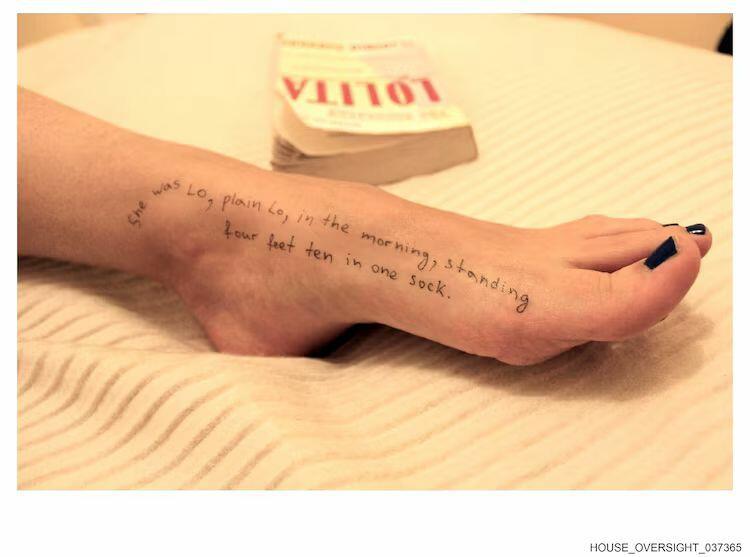 The photos show several images where women's body parts have quotes from the book "Lolita" written on them.