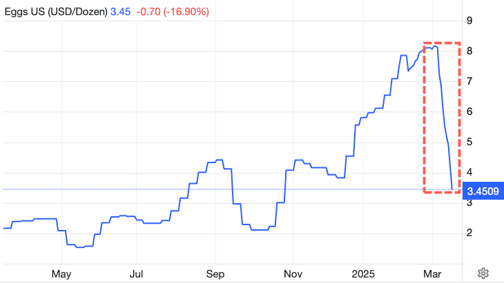 USDA egg prices hit a historic high of $8.17 per dozen on March 3, roughly two weeks ago. Since then, prices have more than halved.