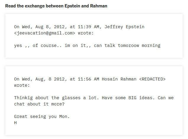 In 2012, Ian Osborne, an adviser to executives and political figures, reconnected the pair and encouraged Mr. Epstein to invest in Jawbone. When Woody Allen was filming “Blue Jasmine” in San Francisco, Mr. Epstein invited Mr. Rahman to visit the set, where Mr. Epstein showed off a pair of high-tech eyeglasses. -NYT