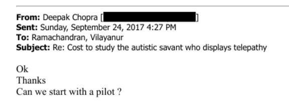 Ramachandran was conducting a study on an "autistic savant who displays telepathy," according to UCSD's The Guardian, citing a Sept. 25, 2017 email with the subject "Cost to study the autistic savant who displays telepathy," in which he tells Chopra, "i don't have a problem with my lab being funded by epstein ... so long as theres no UC connection."