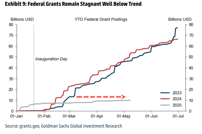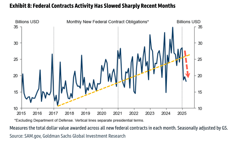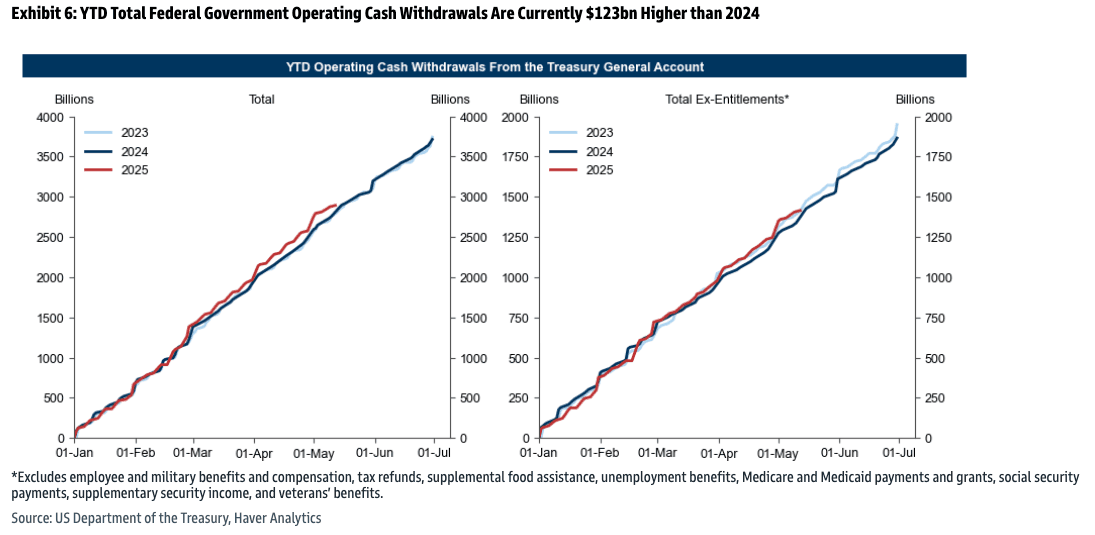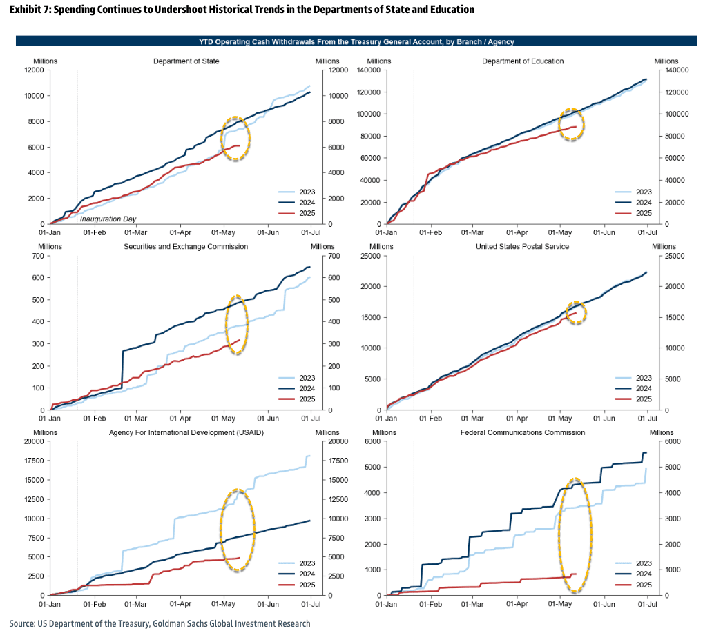 Adding to the visible signs of progress, Goldman chief economist Jan Hatzius, along with analysts Alec Phillips and others, noted Thursday that cash withdrawals from the Treasury General Account across several federal agencies continue to fall below 2023 and 2024 levels—yet another encouraging sign of success.