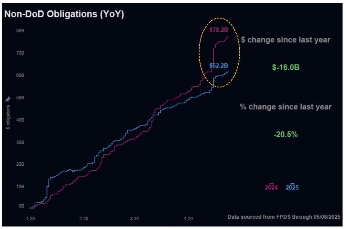 Another measure of DOGE's early success is the 20.5% reduction in non-defense federal obligations compared to 2024 levels—a decline that signals reduced future cash outlays as these obligations come due.