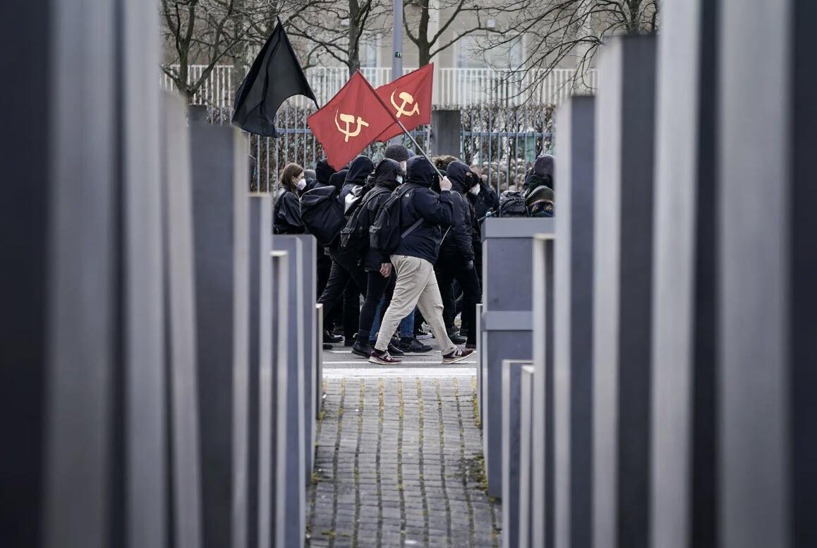 Antifa protesters carrying communist flags march past the Holocaust Memorial while demonstrating against gatherings of neo-Nazis nearby in the city center in Berlin on March 20, 2021. Sean Gallup/Getty Images