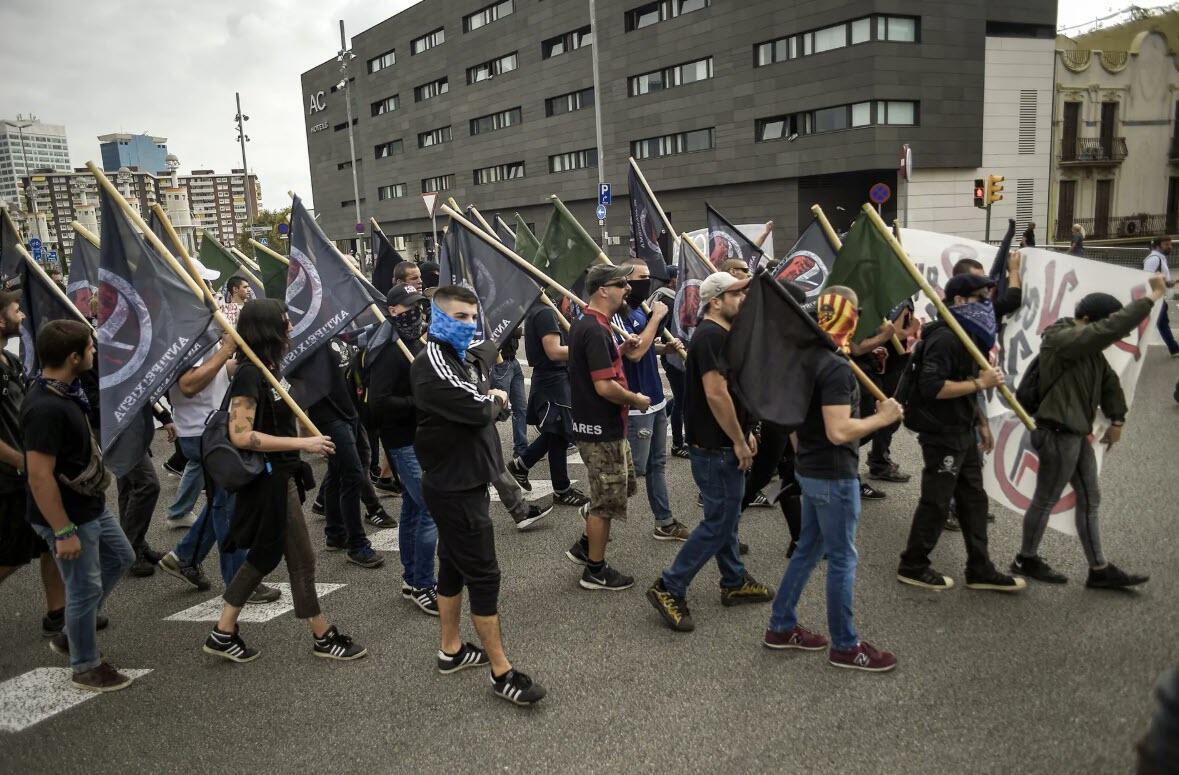 Protesters march during an anti-fascism demonstration in Barcelona on Oct. 12, 2017. Jorge Guerrero/AFP via Getty Images