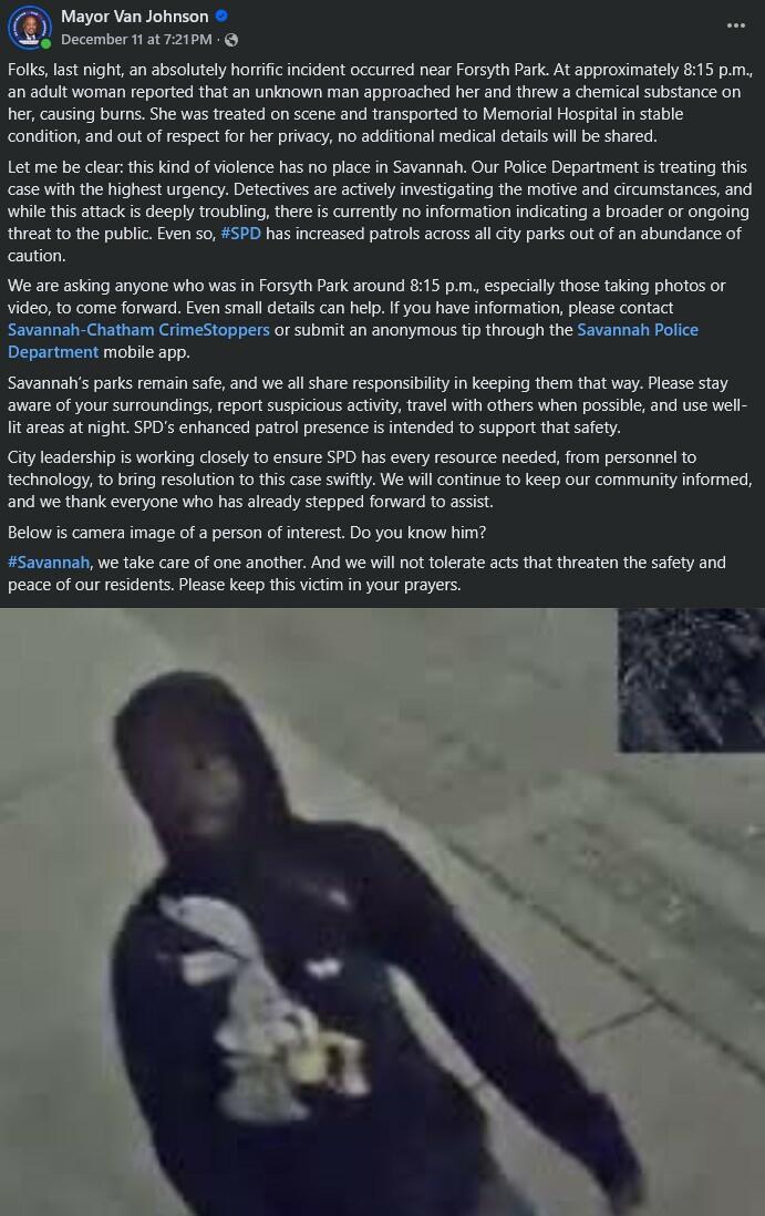 "Our Police Department is treating this case with the highest urgency," said Savannah Mayor Van Johnson in a Thursday Facebook post.