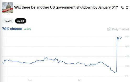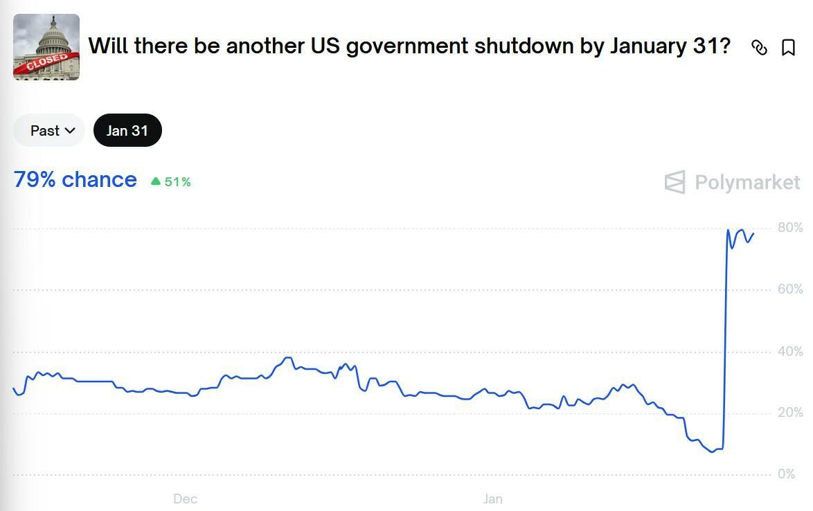 Polymarket odds of a shutdown by Jan. 31 (Saturday) are now hovering around 79%.