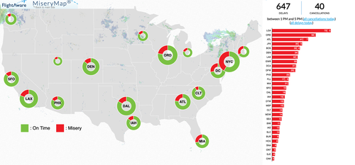Here are the latest U.S. flight delays and cancellations via FlightAware.