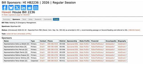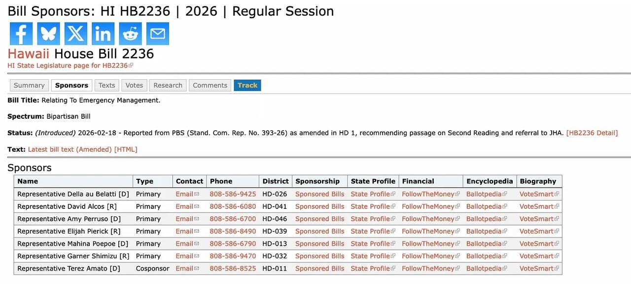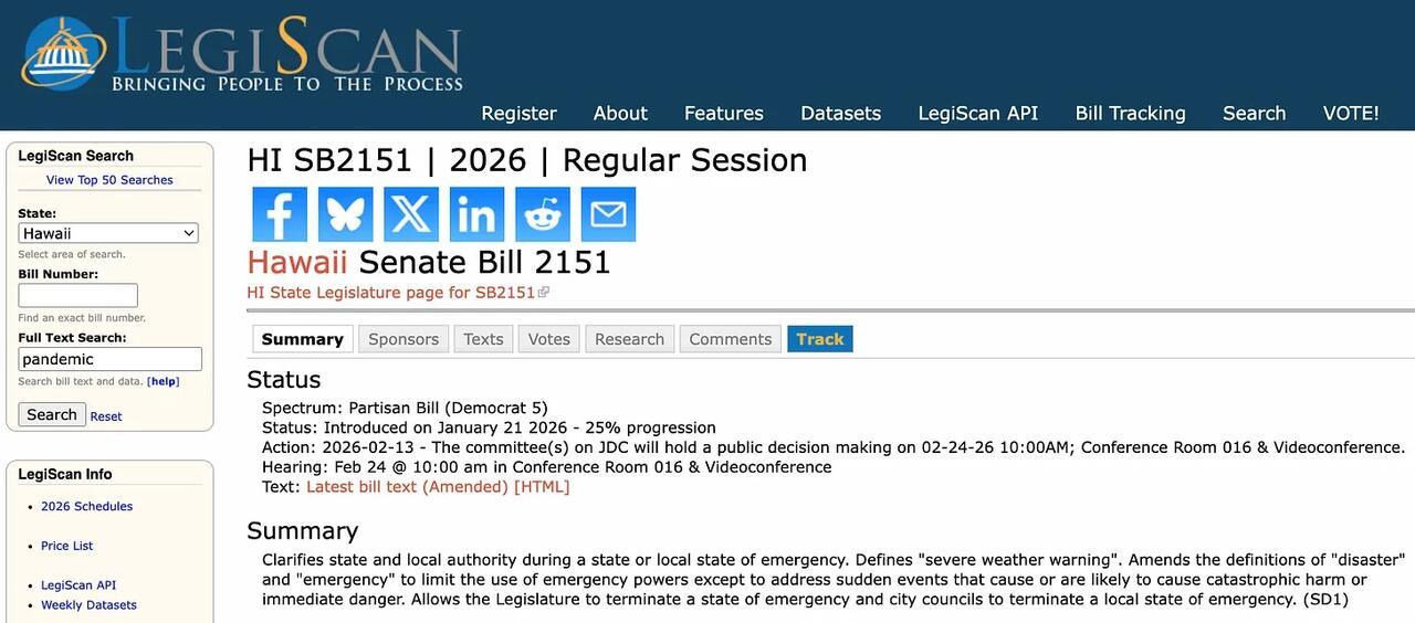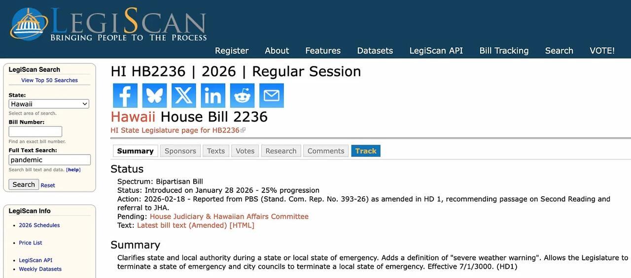 Legislative records show the bills are formally linked, with each designated as “Same As/Similar To” the other, confirming that Hawaii’s full legislature—not just one chamber—is advancing the emergency powers framework.
