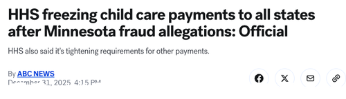 The action phase began Tuesday when HHS froze all federal childcare funding for Minnesota, citing rampant fraud allegations attributed to Somali-linked daycare operators. By Wednesday night, the funding suspension had been expanded nationwide.