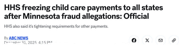 ABC News was the first to report HHS' move to cut all federal funding to daycares nationwide until operators can prove their legitimacy.