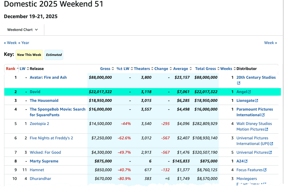 From December 19 to 21, Mojo's data showed that David was in 3,118 theaters and earned $22 million over the weekend, placing it in the number two spot, just behind Avatar: Fire and Ash.