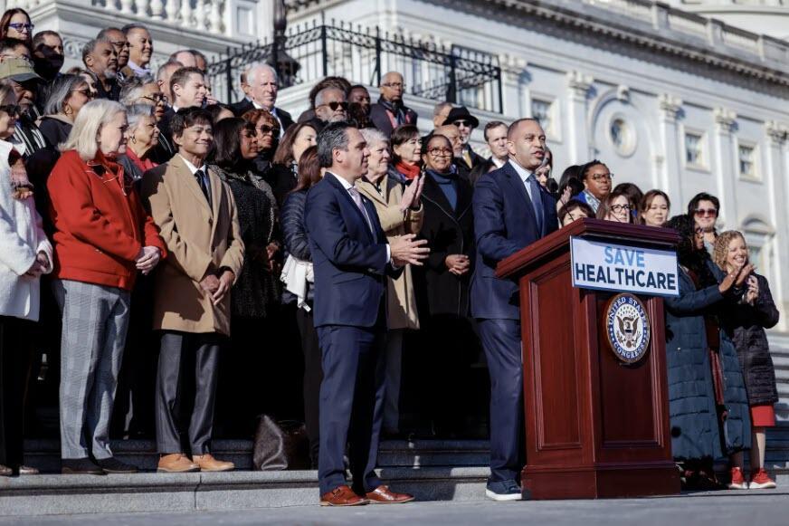 House Minority Leader Hakeem Jeffries (D-N.Y.) and fellow Democrats hold a news conference on the East Front Steps of the U.S. Capitol on Dec. 18, 2025. Jeffries said on Jan. 5 that House Democrats are seeking to extend the Affordable Care Act tax credits, which expired on Dec. 31, 2025. Heather Diehl/Getty Images
