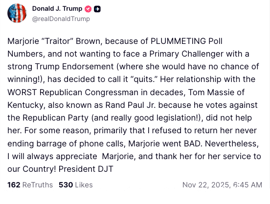 — Marjorie Taylor Greene 🇺🇸 (@mtgreenee) November 22, 2025