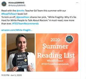 Jessica Ellison, who became NCHE Executive Director in 2023, recommended the controversial book White Fragility to teachers in June 2020.