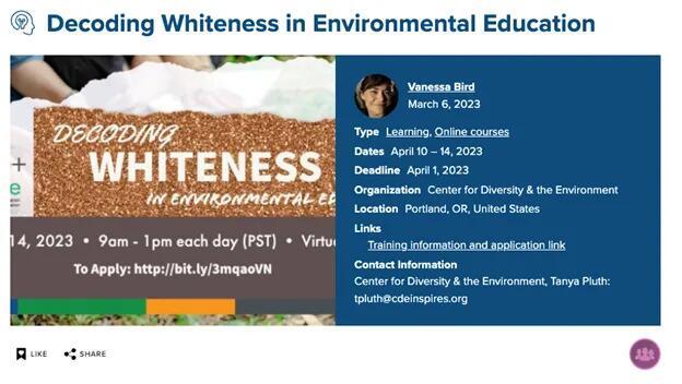President Trump’s Executive Order on Ending Illegal Discrimination and Restoring Merit-Based Opportunity prohibited DEI practices for federal contractors. Before this order was given, the NAAEE website was replete with “Justice, Equity, Diversity, and Inclusion” (JEDI) content. Teachers were recommended resources like “Teaching About Race, Racism, and Police Violence” by the Southern Poverty Law Center, “Your Kids Aren’t Too Young to Talk About Race,” and “A Guide to Gender Identity Terms.”
