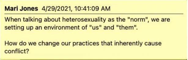 During a 2021 DoDEA presentation on implementing SHAPE standards, a DoDEA teacher articulated the extremist ideology inculcated by SHAPE, writing in presentation materials that talking about “heterosexuality as the ‘norm’” somehow “causes conflict.”