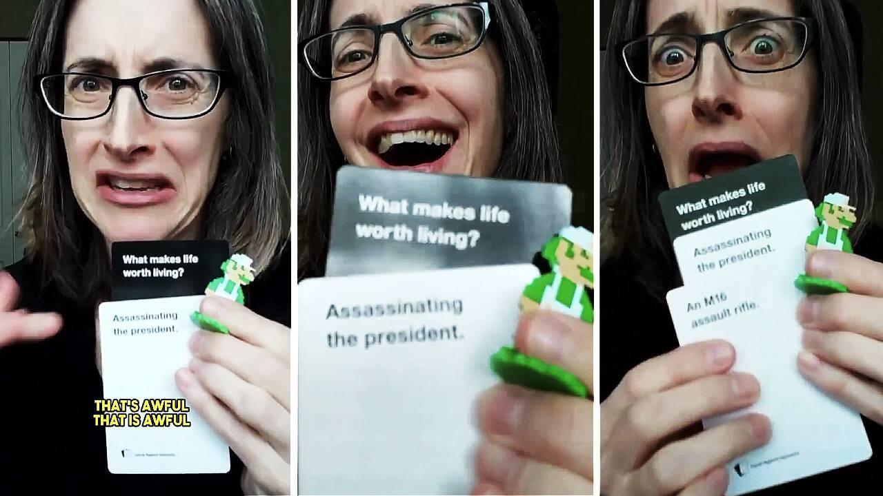 She then holds up several cards that ‘joke’ assassinating the president of the United States with an assault rifle makes “life worth living.”