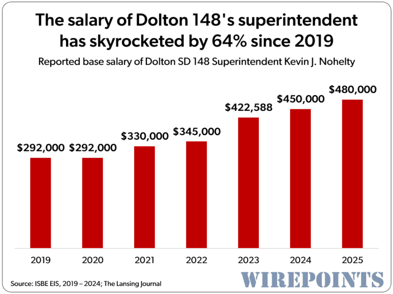 First the background. The Lansing Journal reports that Dolton School District 148’s Superintendent Kevin J. Nohelty is set to receive a salary of $480,000, a hike of $30,000. Nohelty’s pay increases, up $188,000 since 2019, look like the surge that many superintendents in Illinois get at the end of their careers. Salary spiking, they call it. It pumps up operating costs and eventually, it turns into a big pension. More on that later.